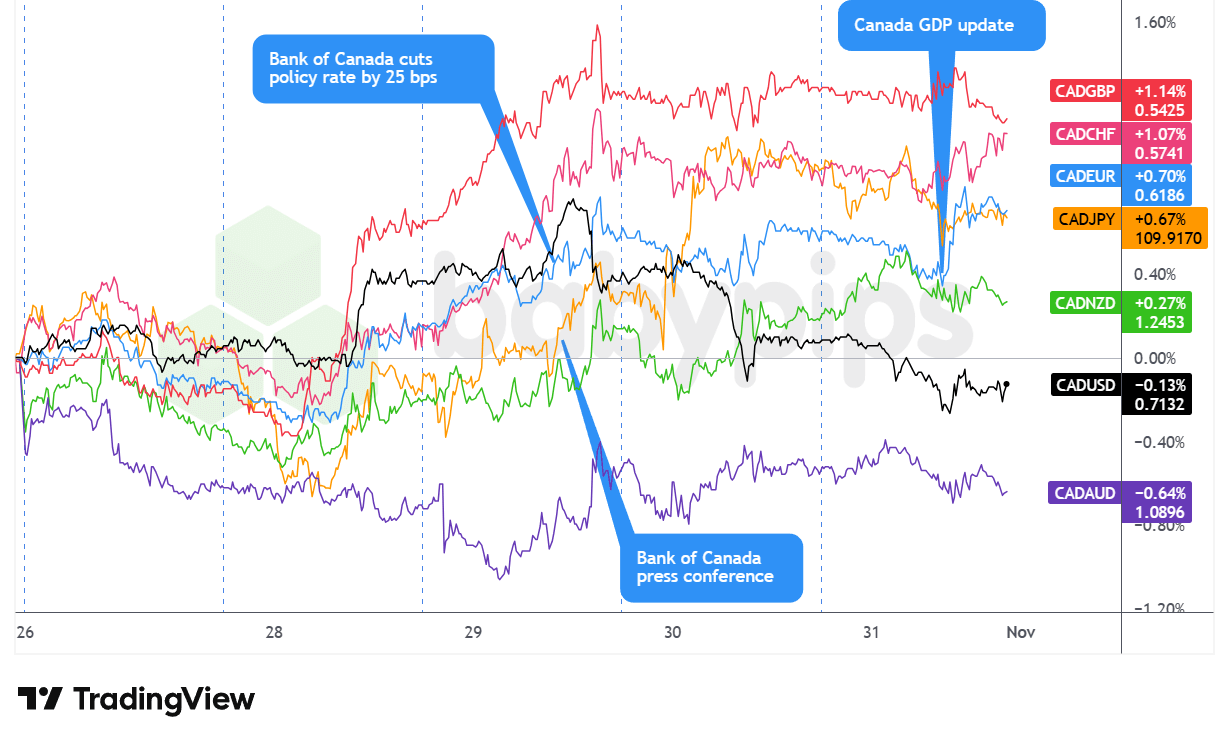 Overlay of CAD vs. Major Currencies Chart by TradingView