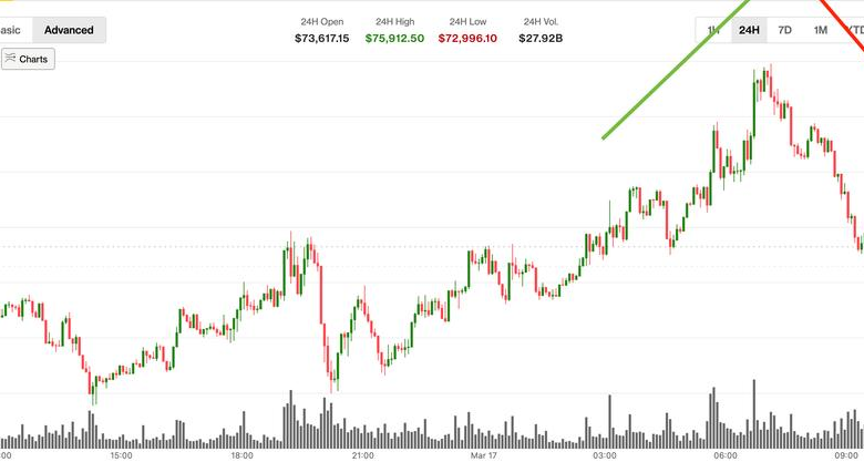 Bitcoin has fallen back below $75,000, highlighting the fragility of its early Asian session rally to six-week highs.