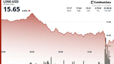 تكنلوجيا اليوم 2025-11-03 17:51:00 Chainlink’s LINK token fell 10% on Monday, plunging to its weakest price since the October 10…