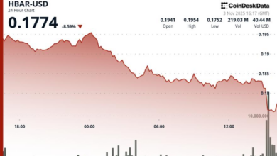 تكنلوجيا اليوم 2025-11-03 16:40:00 Hedera’s HBAR token slid 5% over the past 24 hours, falling from $0.1932 to $0.1835 after…